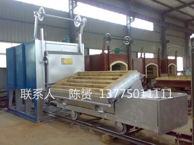 炉门装置由炉门、炉门提升机构和炉门压紧装置组成。炉门壳体由型钢与板材焊接而成牢固框架结构,内用耐火纤维压制模块叠铺而成,要求保温性能好,重量轻等。炉门的提升装置采用电动装置,主要由炉门架、炉门提升横梁、减速器、链轮、传动轴和轴承等部分组成,炉门升降通过减速器上正反传动来带动炉门的升降。炉门提升减速器还配有刹车装置,可以有效防止炉门在升降过程中产生位移。炉门压紧装置采用国内先进的弹簧式压紧结构,当炉子需要提升时,炉门的自重通过杠杆将炉门自动松开,并水平移出一段距离后上升,当炉门下降到位,炉门放下到台车上的滑轮上面需压紧时,由弹簧的弹力再通过杠杆将炉门水平移进到压紧密封状态,此种结构的压紧装置使炉门上的纤维平面与炉口棉之间无摩擦产生,具有性能好、使用使命长的特点。台车框架采用型钢焊接成形,其钢性保证在满负荷下不变形。内用耐火砖砌筑,易碰撞部位和承重部位用重质砖砌筑,增强炉衬结构强度,台车的行走采用自行式结构,由减速机传动链轮带动走轮在轨道上行走。台车密封采用自动迷宫式结构密封,台车进入炉内通过凸轮及滚轮斜面作用,自动升起后进行密封。台车开出,该密封槽自动落下,密封槽内密封砂经加满后即不必经常添加。台车开出,炉门升降均为电动控制,配有电磁制动器,可防止惯性撞击炉体,并且连锁控制,即稍打开炉门后,自动切断加热元件,同时恢复台车行走机构电源。炉门关闭到位后,自动切断台车行走机构电源,同时恢复加热元件电源。